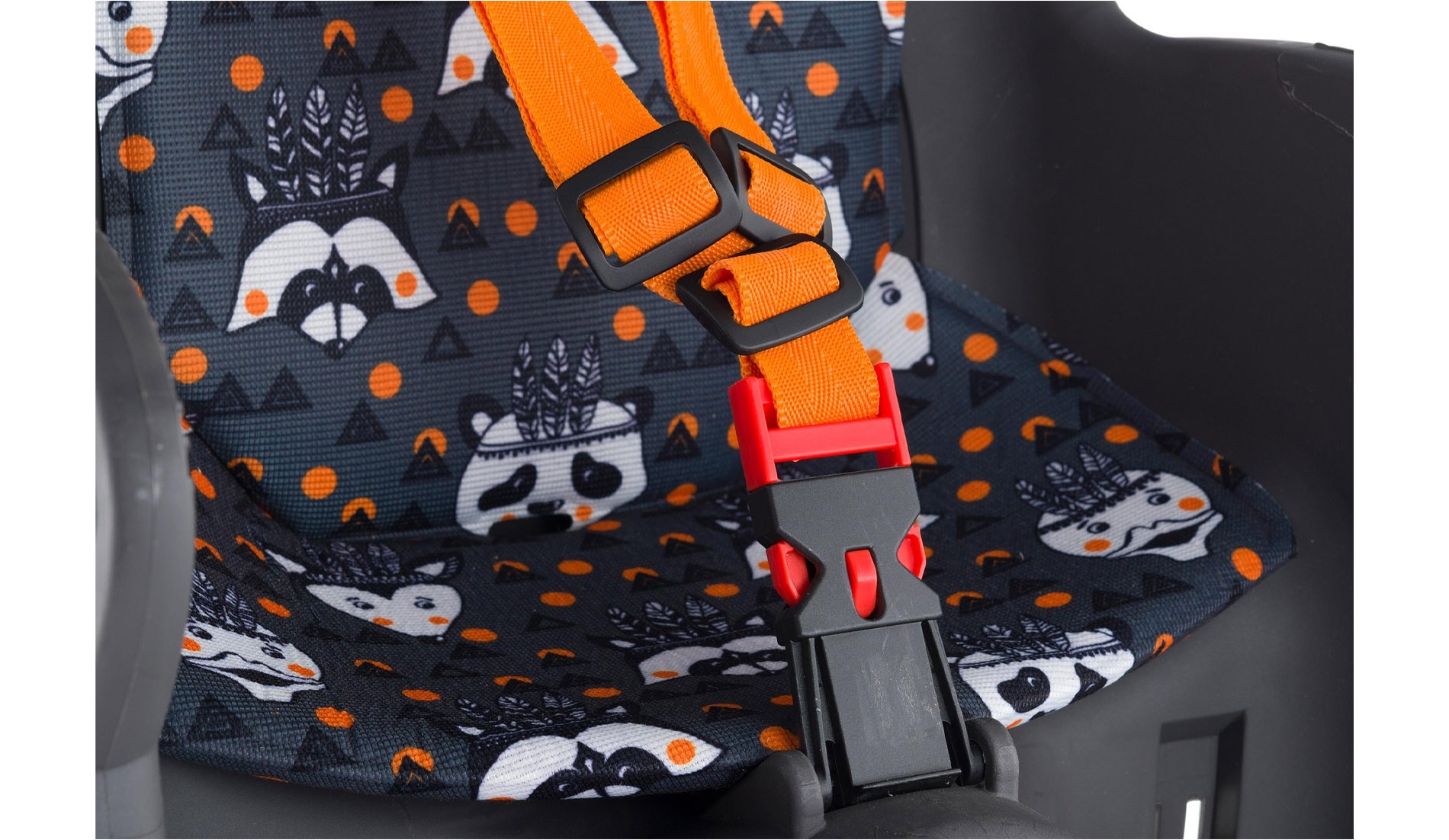 Fotelik montowany jest z tyłu roweru, na ramie, co zapewnia stabilną pozycję dziecka oraz dobrą amortyzację podczas jazdy po nierównościach.