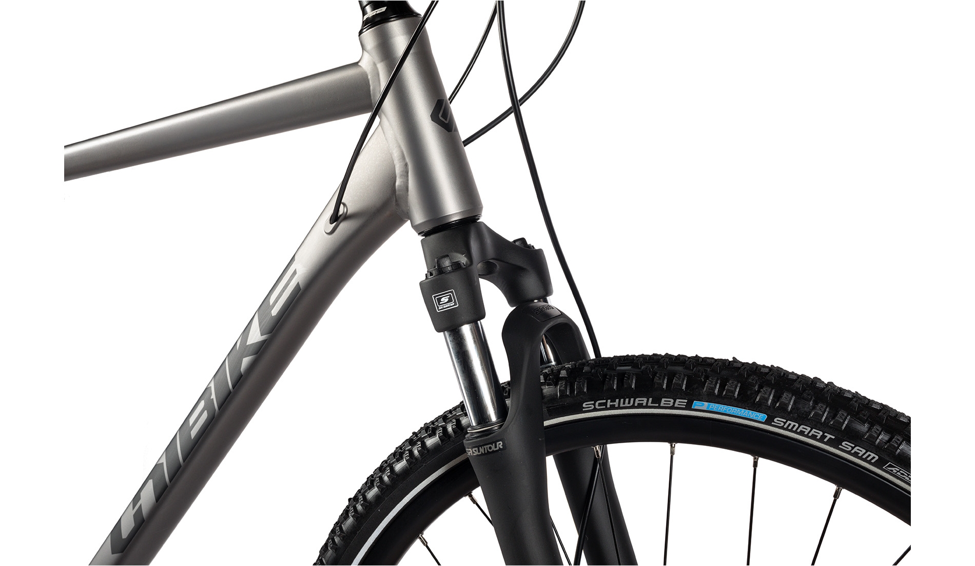 Koła 28" z wytrzymałymi obręczami JHT DISC, piastami Shimano QC300 i oponami Schwalbe Smart Sam 28×1.65 zapewniają doskonałą przyczepność i stabilność na różnych nawierzchniach – od asfaltu po szutrowe ścieżki.