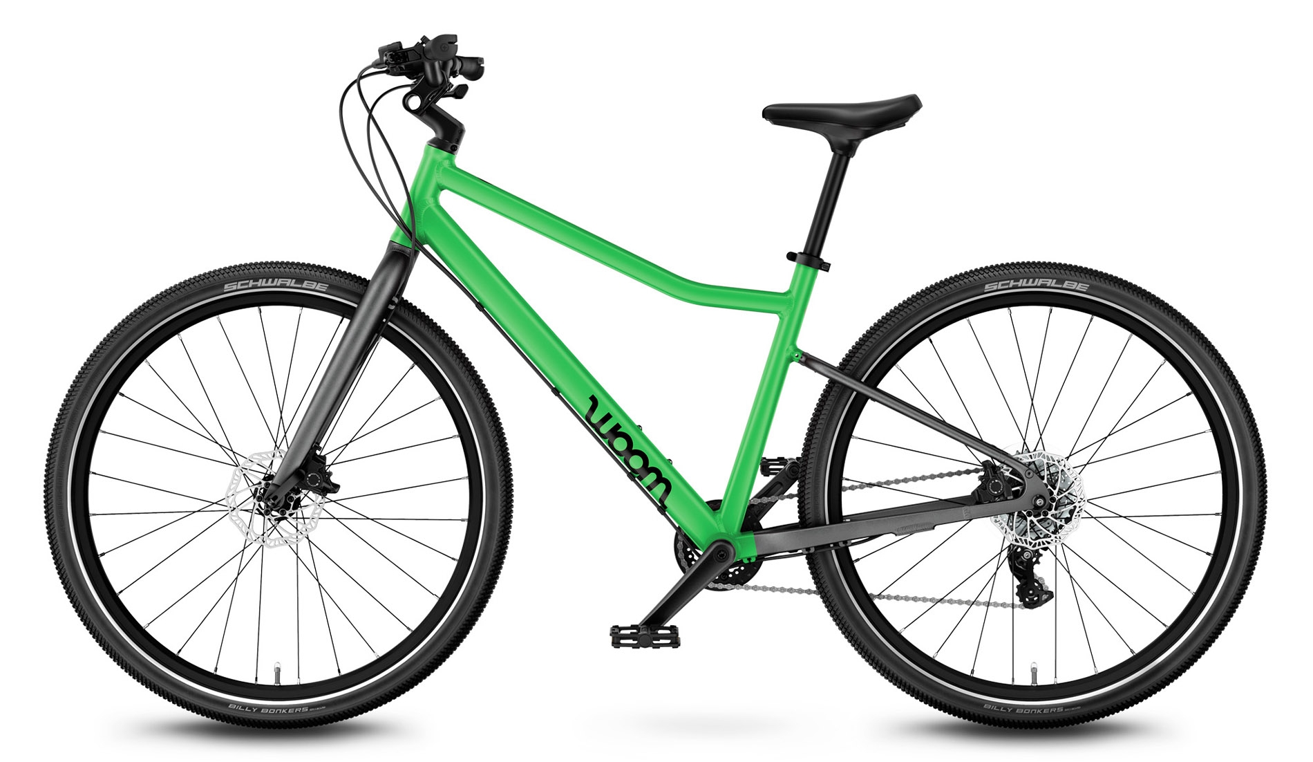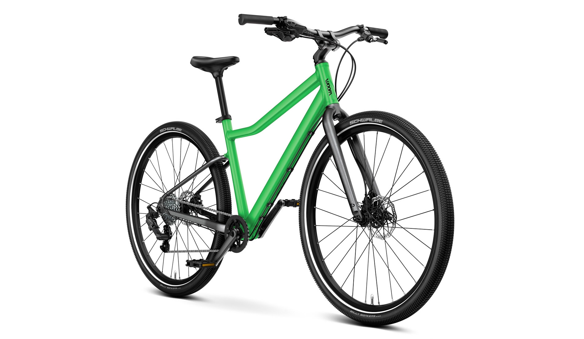 Koła | Ultralekkie aluminiowe obręcze | Aluminiowe piasty z uszczelnionymi łożyskami i mocowaniem na błotniki woom SNAP click-on | Przednie koło z osią szybkozamykającą dla łatwego demontażu/montażu | Tylne koło przykręcane | 28 lekkie, wyjątkowo wytrzymałe szprychy ze stali nierdzewnej, zaplatane na krzyż |