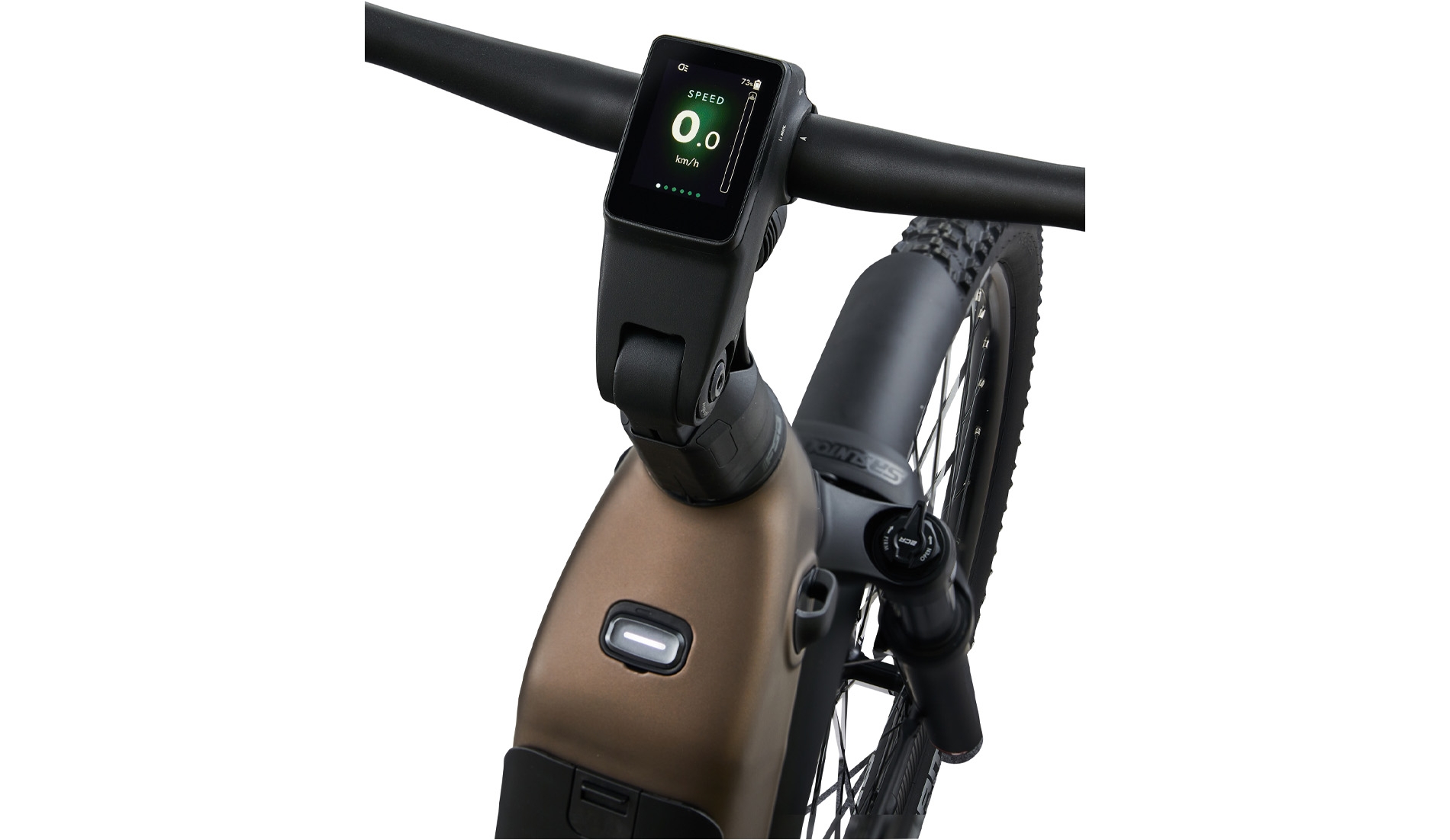 Wygodny dostęp do kierownicy i wyprostowana sylwetka zapewniają idealny balans między komfortem a kontrolą, redukując zmęczenie przy jednoczesnym zachowaniu responsywnego prowadzenia. Zaprojektowany z myślą o długich wyprawach w zmiennych warunkach, kokpit integruje obsługę RideControl do zarządzania trybami wspomagania oraz — w odpowiednio wyposażonych modelach — elektroniczną zmianę przełożeń dla napędów Enviolo i Shimano. Wszystko to zrobisz bez odrywania rąk od kierownicy, co pozwala Ci skupić całą uwagę na torze jazdy i manewrowaniu, a nie na obsłudze przełączników.