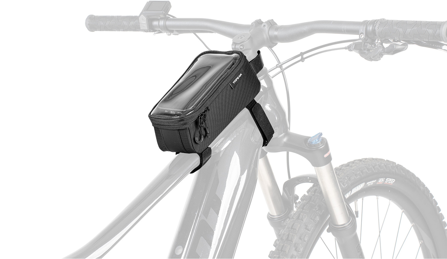 Torba na górną rurę ramy i etui na telefon w jednym – rozwiązanie 2 w 1 wyposażone w przezroczystą folię ochronną, która pozwala na korzystanie z telefonu nawet wtedy, gdy znajduje się on w torbie. Druga komora torby zawiera przegródki ułatwiające porządkowanie i przechowywanie drobnych przedmiotów, takich jak karty kredytowe, drobne monety, klucze i inne rzeczy osobiste.